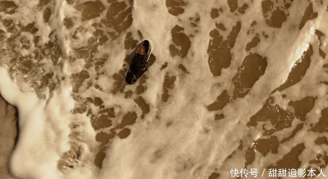 海浪上泡沫滚滚,一只皮鞋无力地被冲了上来,被海浪不停地淹没、翻转、蹂躏。